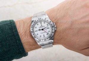 In March 2012, the famous film director James Cameron successfully sneaked into the deepest point of the Mariana Trench, the Challenger Abyss, refreshing the single-person deep dive record. The one that accompanied him to complete this journey was Rolex Deepsea Challenge that was attached to the outside of the submersible. The 51.4 mm Rolex Sea-Dweller fake watch with black dial features a very thick case. It is water resistant to a shocking depth of 12,000 meters.
